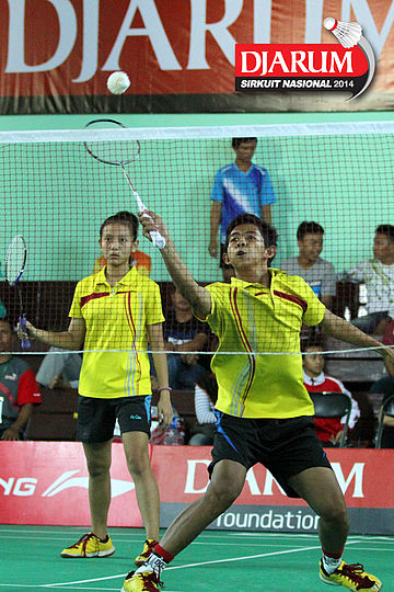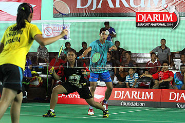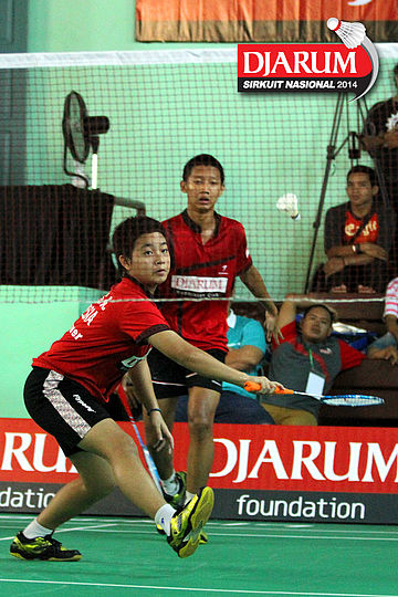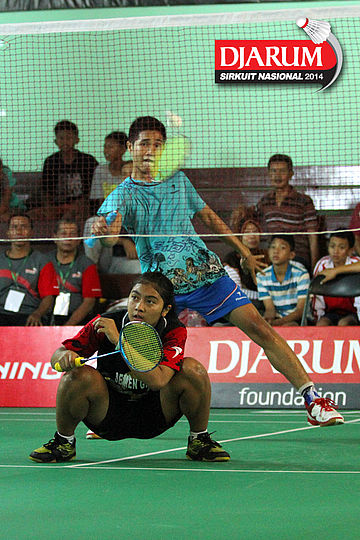 Rizal May/Tabita Christian (Hi Qua Wima) mengembalikan shuttlecock ke arah Deni Surya/Nabila (Semen Gresik)