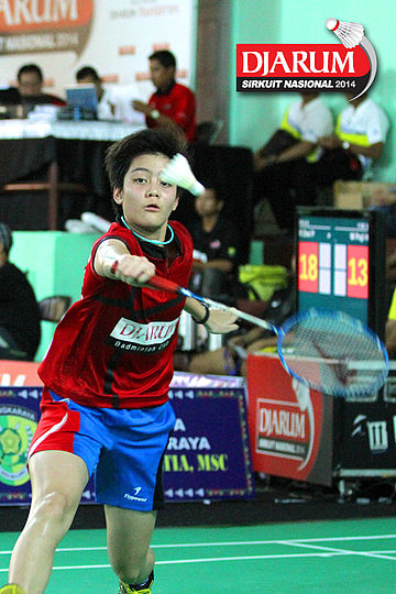 Tania Oktaviani (PB Djarum) bersiap mengembalikan shuttlecock ke arah Virny Putri (Jaya Raya)