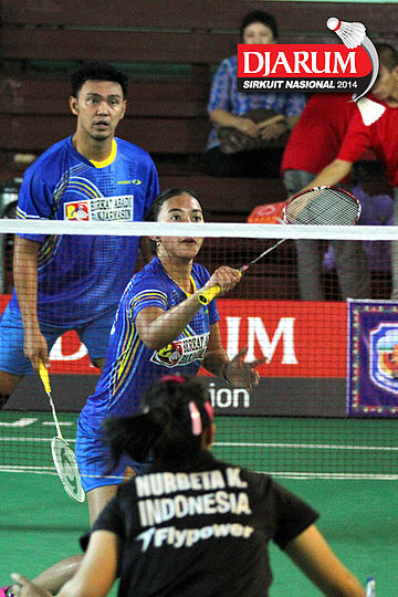 Ardiansyah Putra/Devi Tika Permatasari (Berkat Abadi/SGS PLN) bersiap menyambar pengembalian tanggung dari Arsya Isnanu/Nurbeta Kwanrico (PB Djarum)