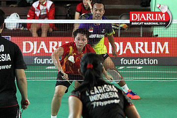Kenas Adi/Jenna Gozali (PB Djarum) berhasil mengembalikan shuttlecock ke arah Anggun Nugroho/Dian Fitriani (Halim/Pertamina)