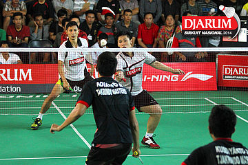 Hantoro/Kenas Adi (PB Djarum) bersiap menyambut pengembalian dari Rahmat Adianto/Seiko Wahyu (Tjakrindo Masters)