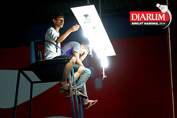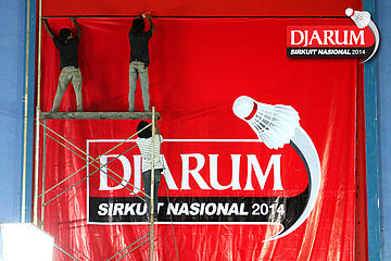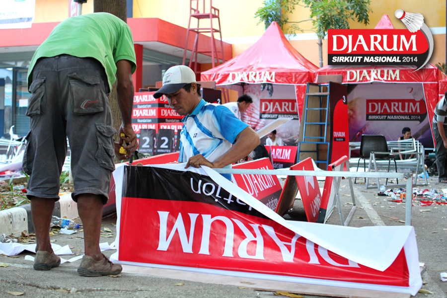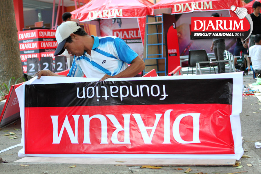 Seorang pekerja sedang memasang ads board Djarum Foundation.