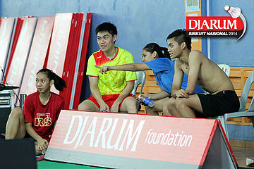 Empat atlet saat beristirahat di pinggir lapangan usai berlatih di GOR Bandar Baru, Batam.