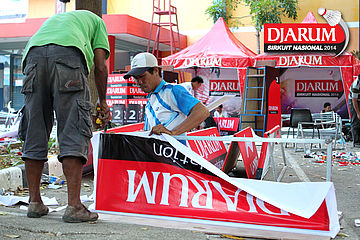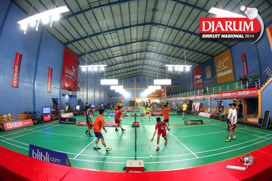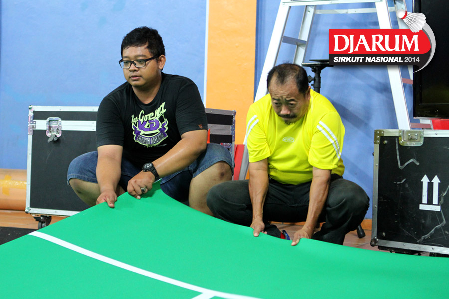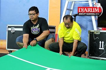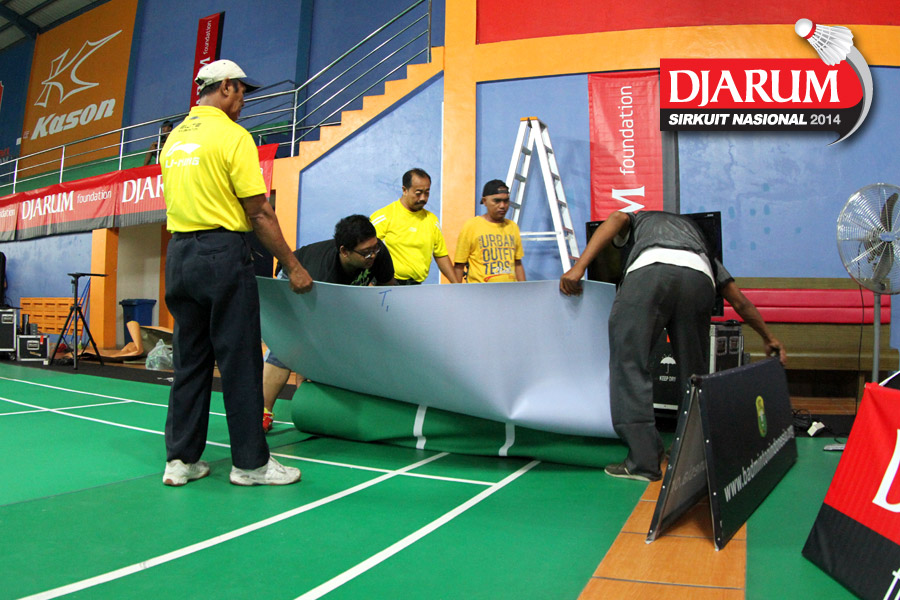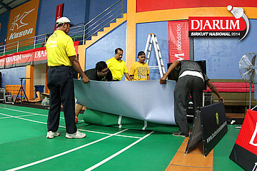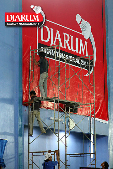 Sejumlah pekerja saat memasangkan giant banner Djarum Sirkuit Nasional 2014 di dalam GOR Bandar Baru, Batam.
