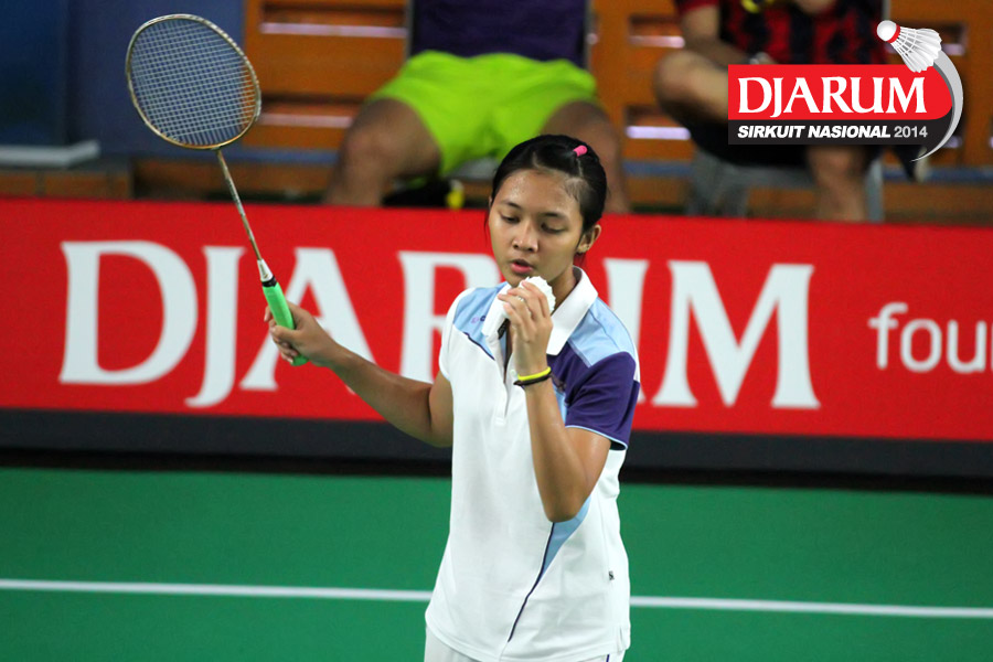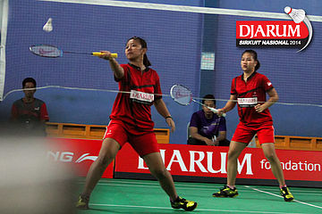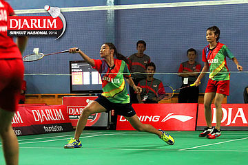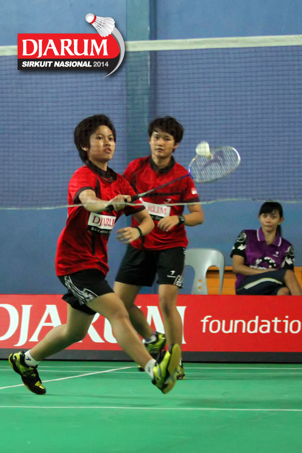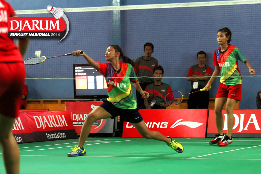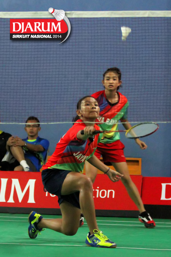 Karina Ria/Wulan Cahya (PB Djarum) mengembalikan shuttlecock ke arah Ni Made Pranita/Sarah Christin (Pelatprov Bali/Pelatprov DKI Jakarta).