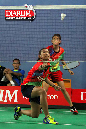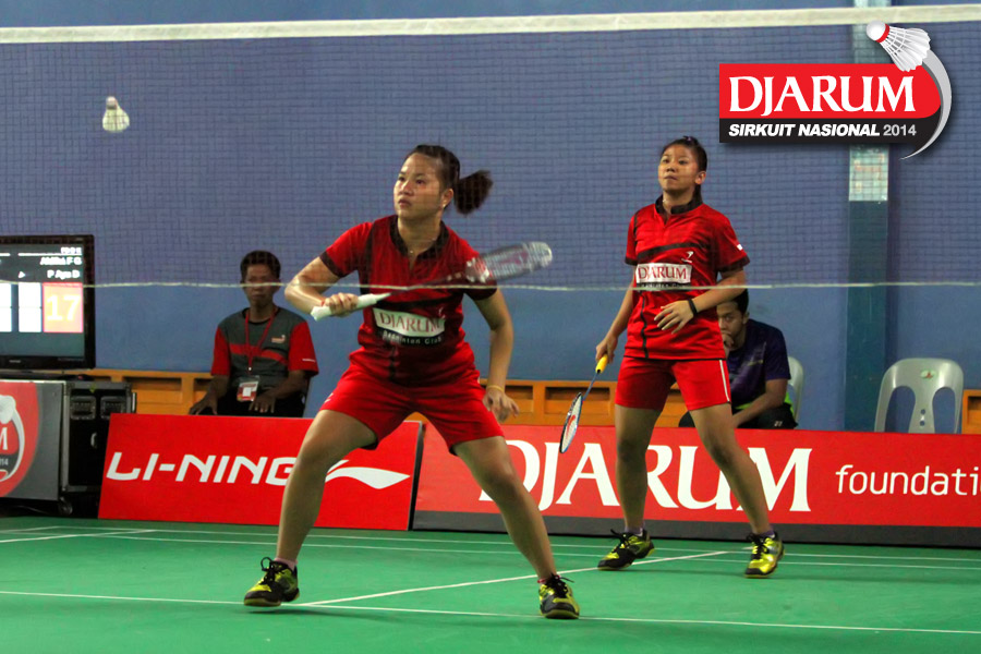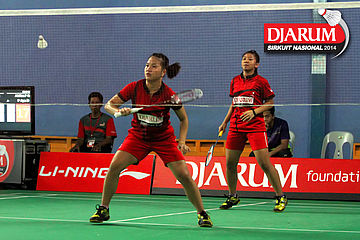 Karina Ria/Wulan Cahya (PB Djarum) bersiap menyambut pengembalian dari Ni Made Pranita/Sarah Christin (Pelatprov Bali/Pelatprov DKI Jakarta).