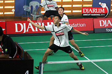Ridho Bianto/Rahmadhani Hestiyanti (PB Djarum) mengembalikan shuttlecock ke arah Anbiya Bramasta/Bunga Fitriani (Mutiara Bandung).