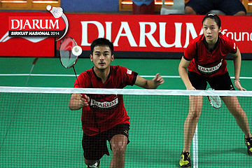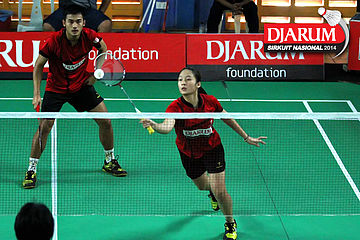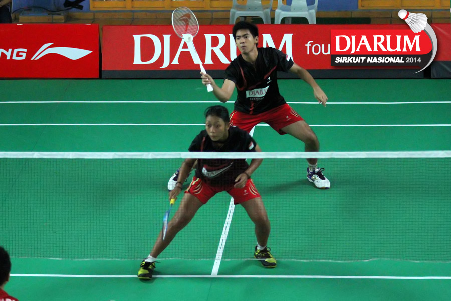 Kuncoro/Meirisa Cindy (Jaya Raya Suryanaga) bersiap menyambut pengembalian dari Vicky Rizky/Rofahadah Supriadi (PB Djarum).