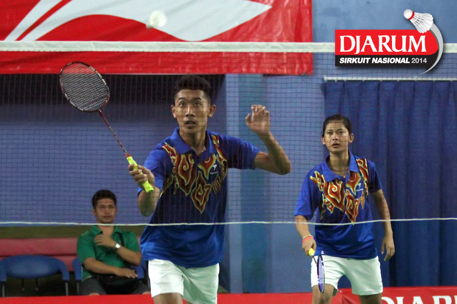Ragawa Tamasuta/Berlian Sudrajat (Semen Gresik) mengembalikan shuttlecock ke arah M. Aria Wijaya/Monica Nggiu (Mutiara Bandung).