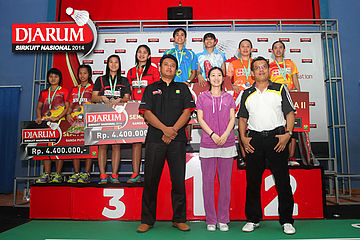 Empat atlet PB Djarum, Tutut Novi, Cynthia Shara, Ramadhani Hestiyanti dan Rofahadah Supriadi (dari kiri) saat di atas podium.