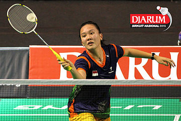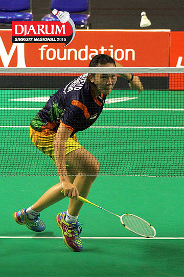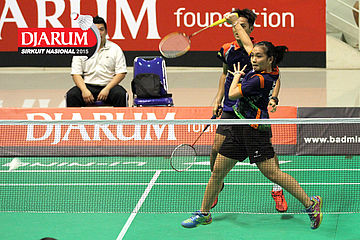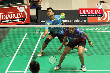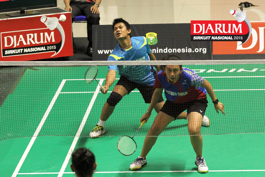 Afiat Yuris/Nadya Melati (Pertamina Fastron) bersiap menyambar pengembalian tanggung.