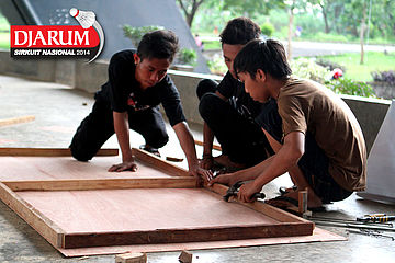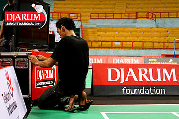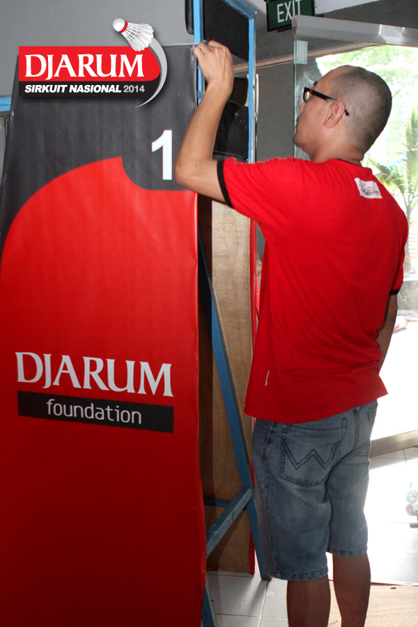 Salah satu pekerja sedang memasang add board Djarum Sirkuit Nasional 2014 di bawah layar live score.