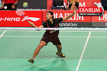 rinda Sari Sinaga (PB Djarum) mengembalikan shuttlecock ke arah Rena Suwarno (Jaya Raya).