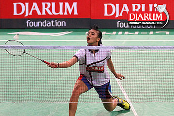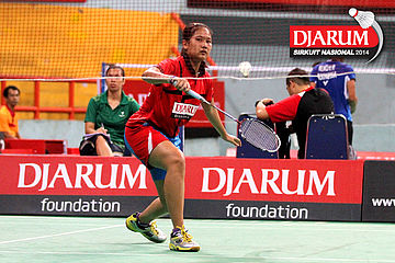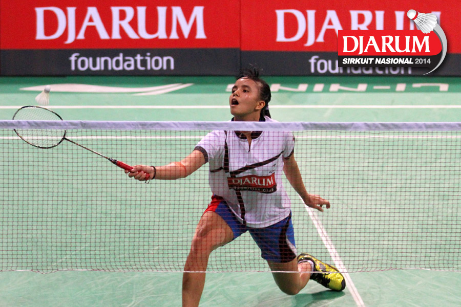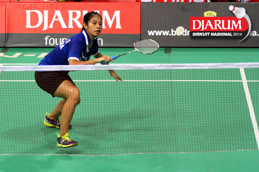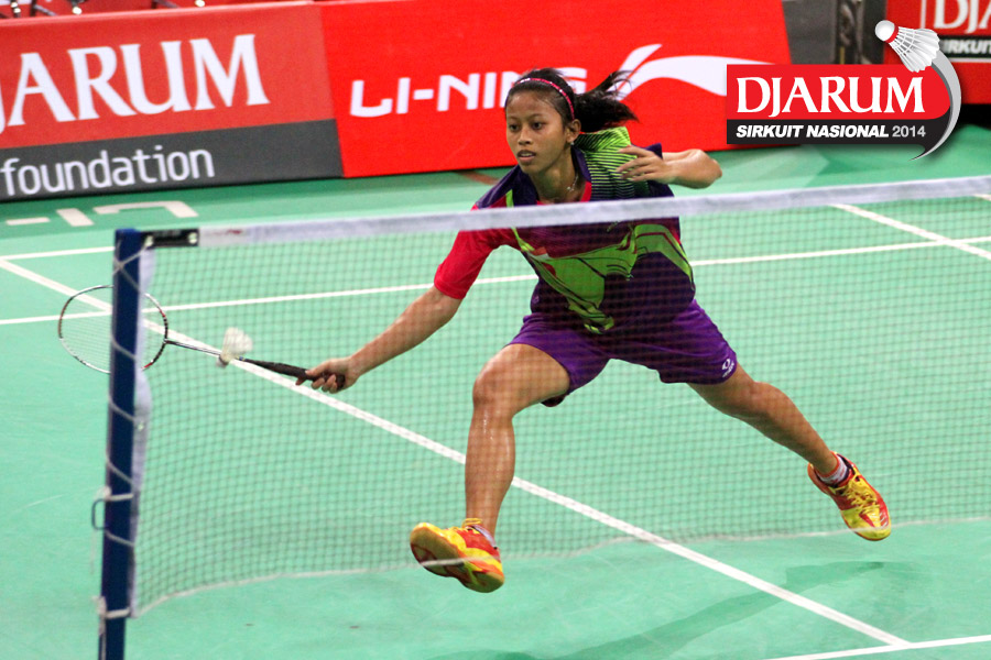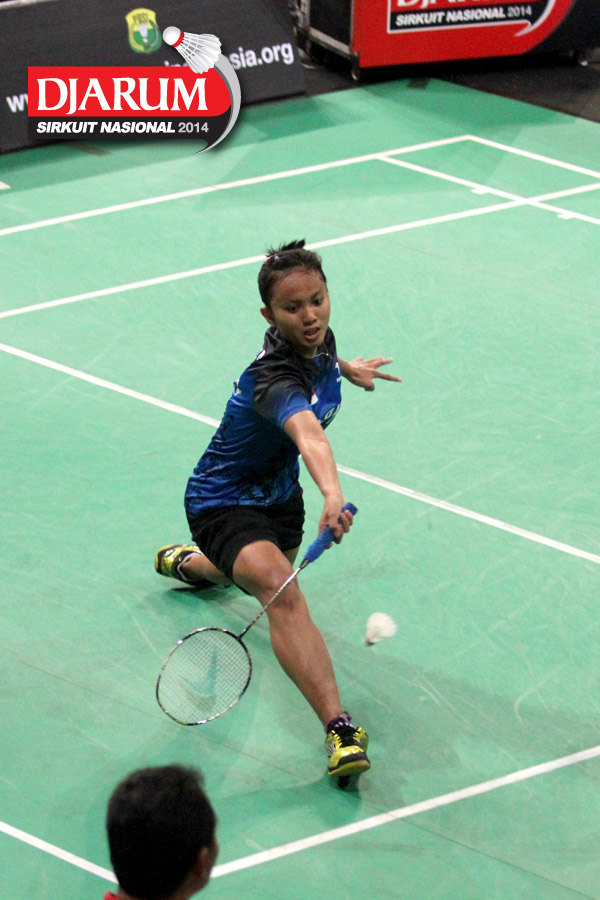 Rena Suwarno (Jaya Raya) mengembalikan shuttlecock ke arah Arinda Sari Sinaga (PB Djarum).