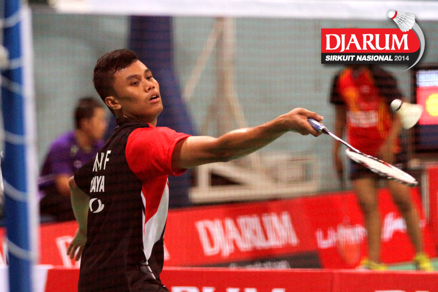 Eka Fajar (Jaya Raya) mengembalikan shuttlecock ke arah Rudi Cahyadi (Sarwendah).