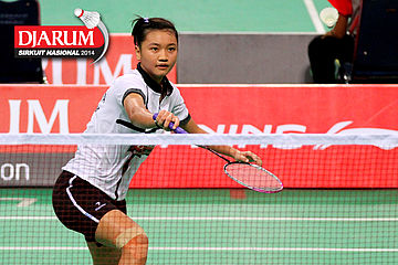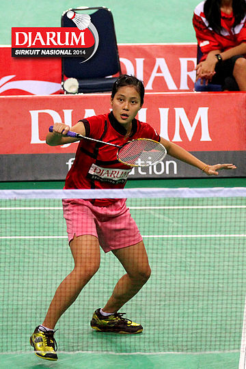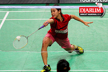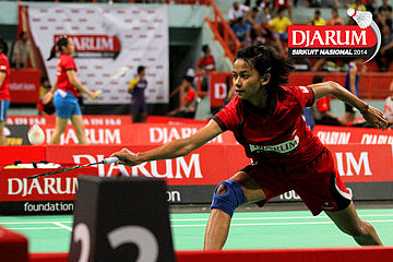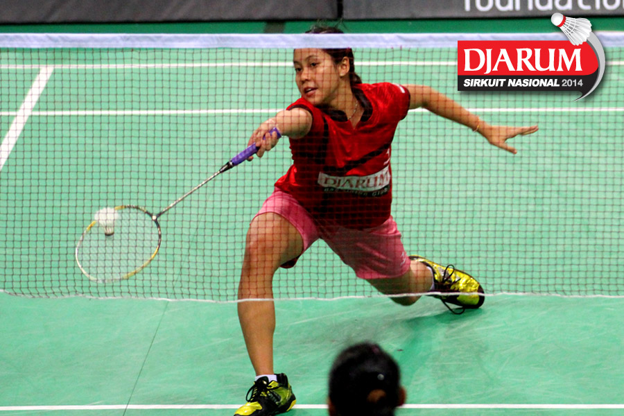 Dinar Dyah Ayustine (PB Djarum) berhasil menggapai dropshoot yang dilepaskan Tike Arieda (Jaya Raya Suryanaga).