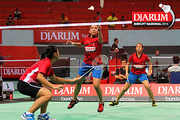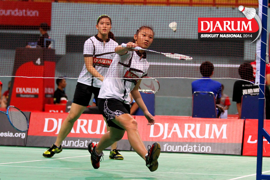 Felicia Parmenas/Mychelle Chystine (PB Djarum) menyambar pengembalian tanggung dari pasangan Brigita Marciela/Meirisa Cindy (Exist/Jaya Raya Suryanaga).