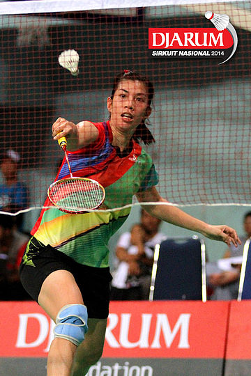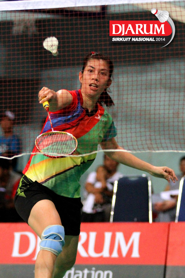 Aida Arum (PB Djarum) berusaha menggapai pengembalian dari Linda Mutiara (Mutiara Bandung).