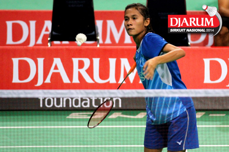 Adriyanti Firdasari (Jaya Raya) bersiap mengembalikan shuttlecock ke arah Mega Cahya (Jaya Raya).