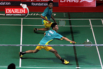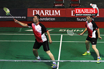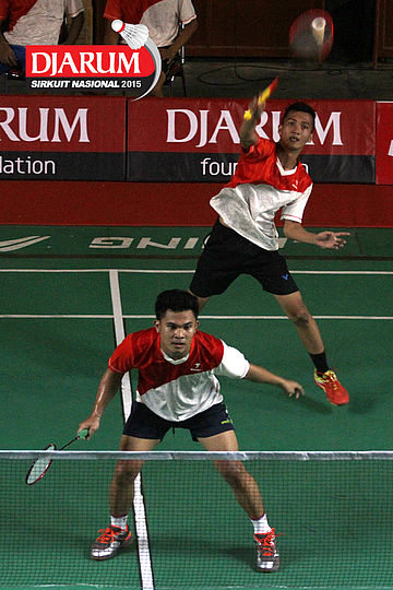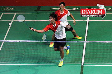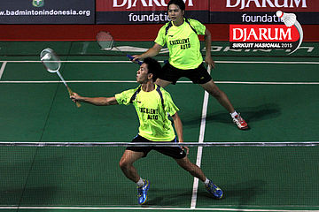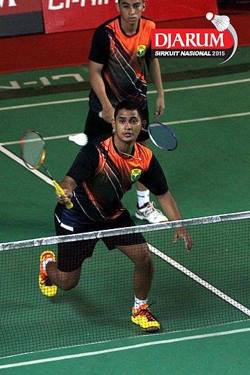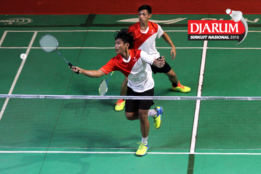 Adrian/Muhidin (Winner BC Manado) mengembalikan shuttlecock ke arah Jordi/Vincent (Mulia Manokwari).