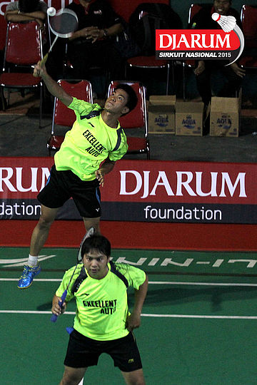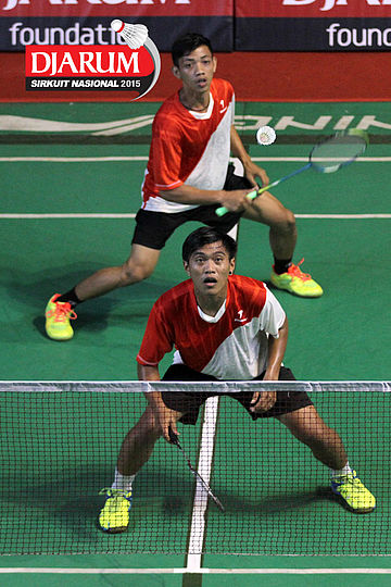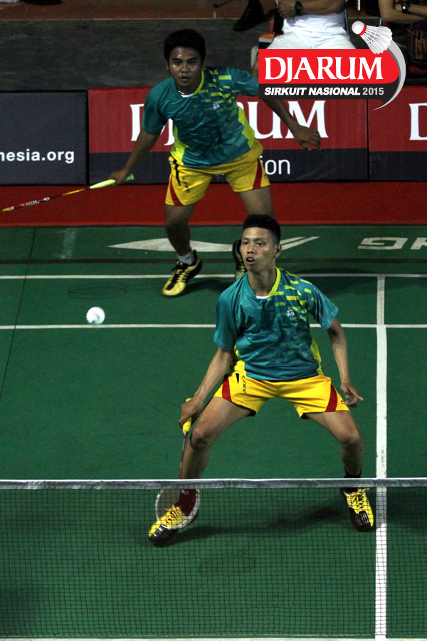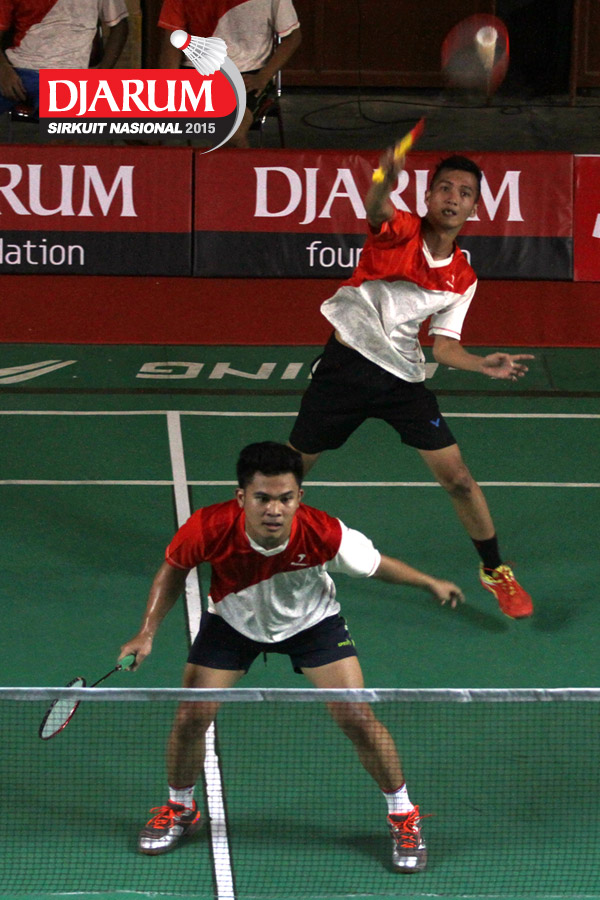 Jordi/Vincent (Mulia Manokwari) menghadang pengembalian dari Adrian/Muhidin (Winner BC Manado).