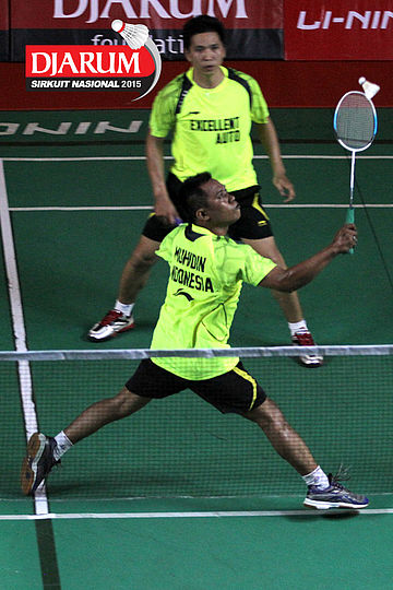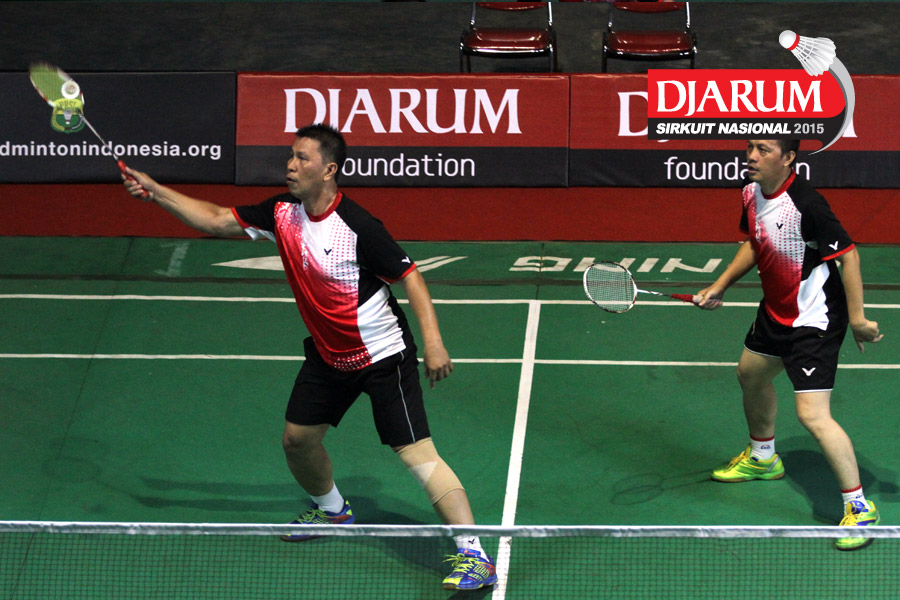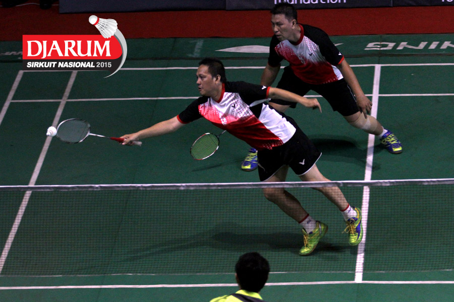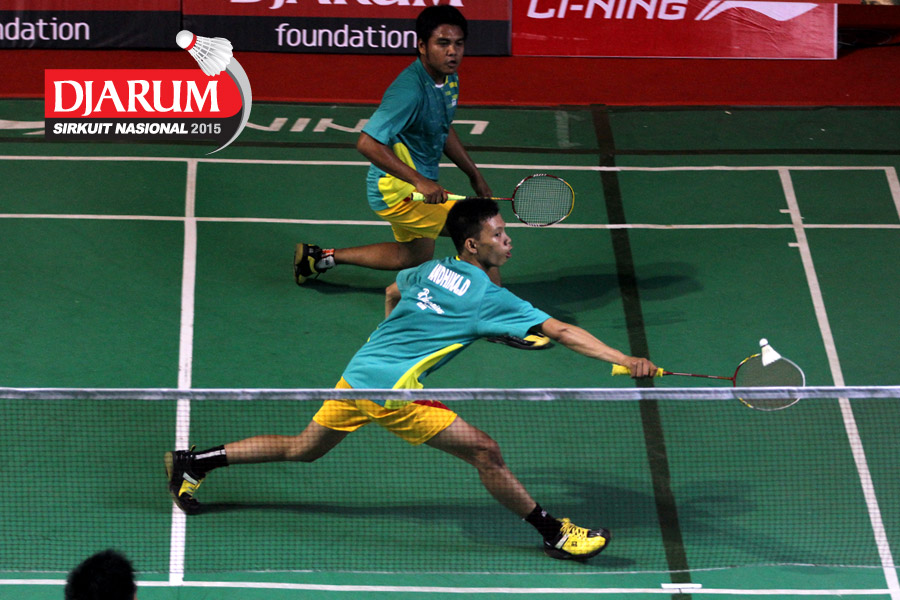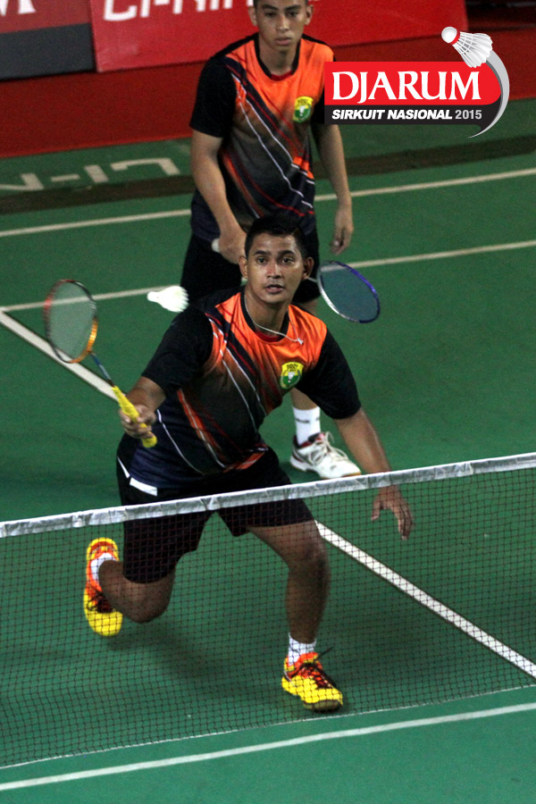 Edwin Poluan/Noldy Selah (Arangga Manado) mengembalikan shuttlecock ke arah Broery Modroringin/Widyaparta (Winner BC Manado).