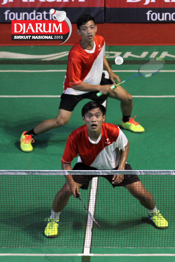 Edwin Poluan/Noldy Selah (Arangga Manado) menghadang pengembalian dari Broery Modroringin/Widyaparta (Winner BC Manado).