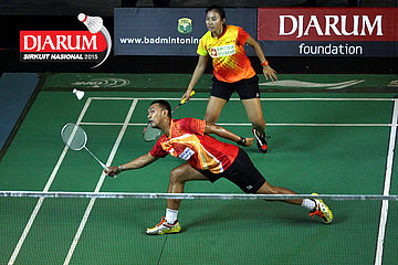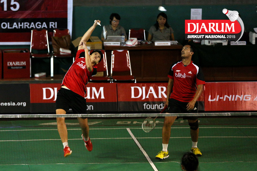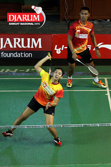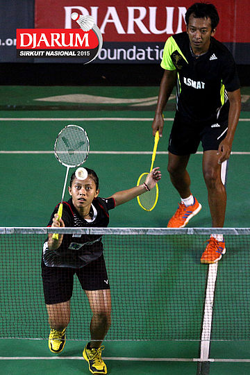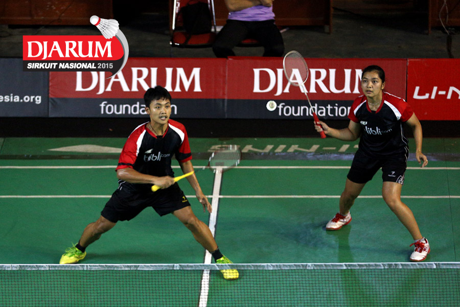 Akbar Bintang/Ristya Ayu (Djarum Kudus) bersiap menghadang serangan yang dilepaskan Anggun Nugroho/Dian Fitriani (Halim/Pertamina Fastron).