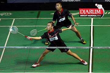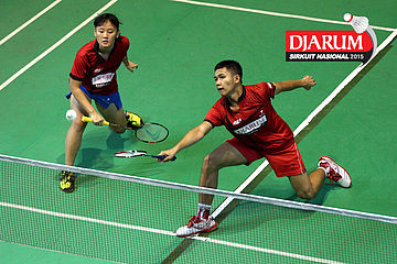 M. Rijal/Shendy Puspa (Djarum Kudus) mengembalikan shuttlecock ke arah Ardiansyah Putra/Devi Tika Permatasari (Berkat Abadi).