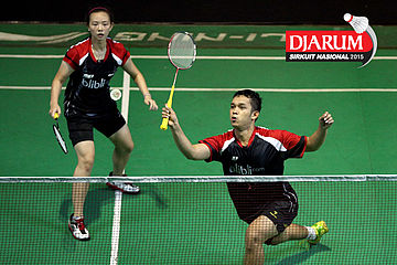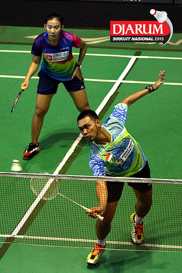 Jeka Wiratama/Della Augustia (Djarum Kudus) bersiap menyambar pengembalian tanggung dari Trikusuma Wardhana/Meiliana Jauhari (Suryanaga/Djarum Kudus).