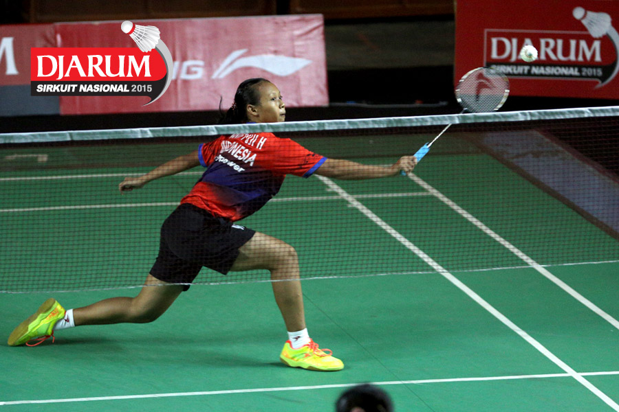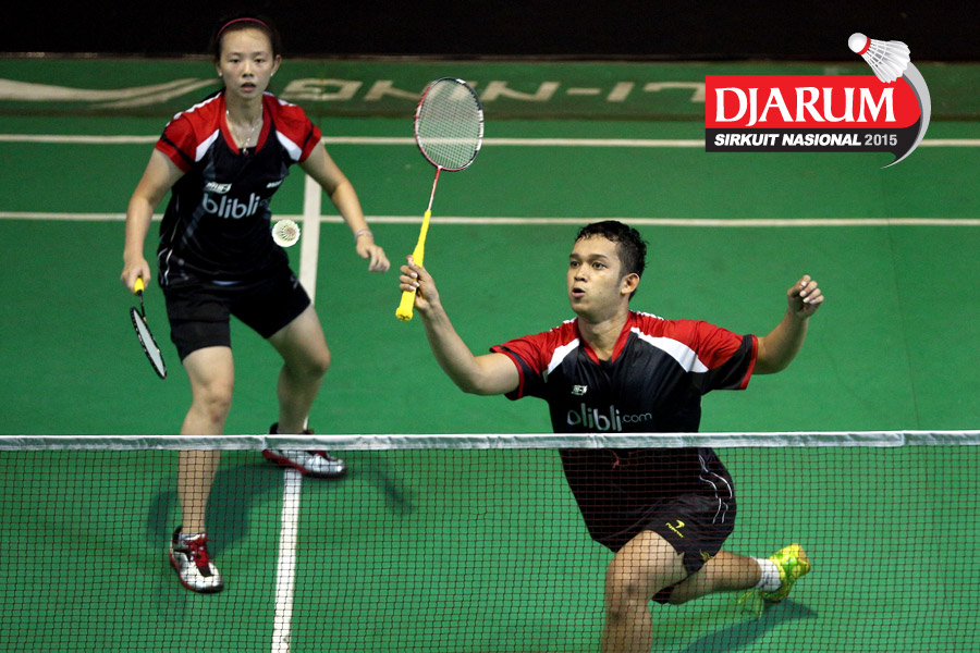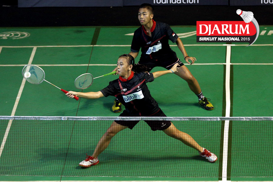 Ardiansyah Putra/Devi Tika Permatasari (Berkat Abadi) mengbalikan shuttlecock ke arah M. Rijal/Shendy Puspa (Djarum Kudus).
