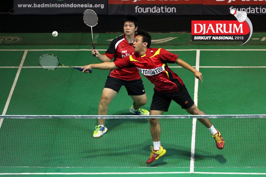 Bagas Kristianto (Djarum Kudus) mengembalikan shuttlecock ke arah Fatturrahman Fauzi (Exist).
