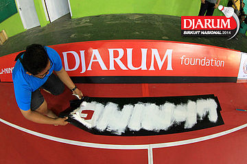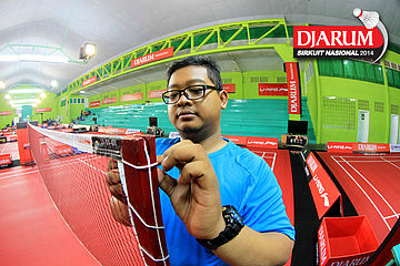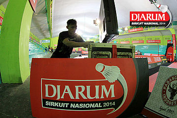 Salah satu pekerja sedang mempersiapkan perlengkapan Djarum Sirkuit Nasional Li-Ning Open Sumatera Barat Open 2014