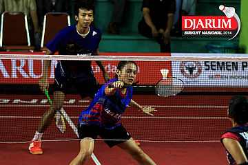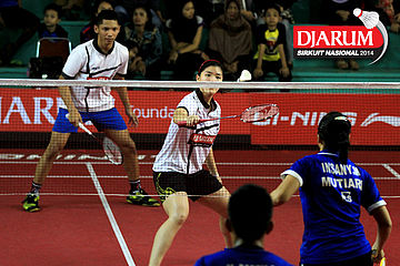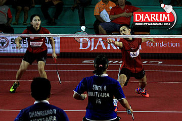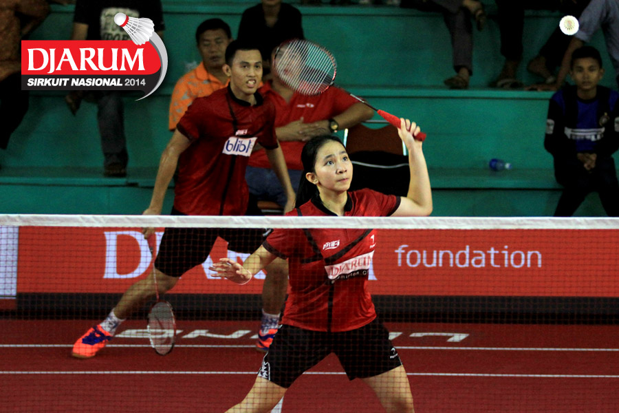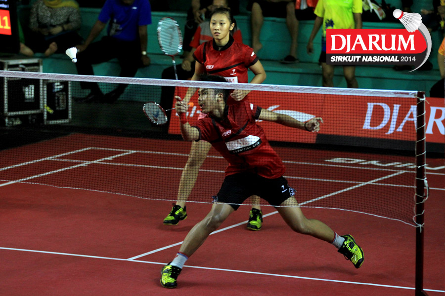 Tedi Supriadi/Mychelle Crhystine (Djarum Kudus) mengembalikan shuttlecock ke arah Reinard Dhanriano/Shinta Arum (Mutiara Cardinal)