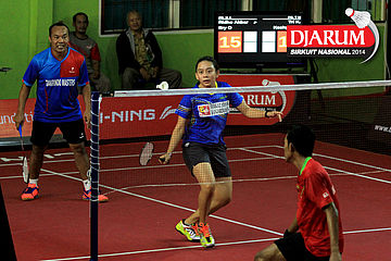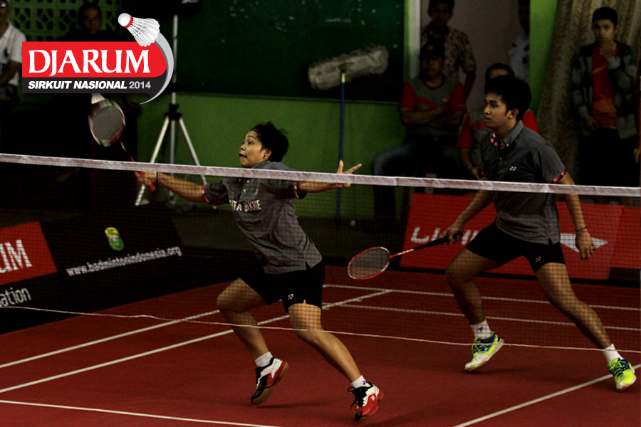 Anggun Nugroho/Sri Wulan (Halim/Jaya Raya) mengembalikan shuttlecock ke arah Ardiansyah Putra/Devi Tika Permatasari (Berkat Abadi/SGS PLN)
