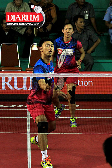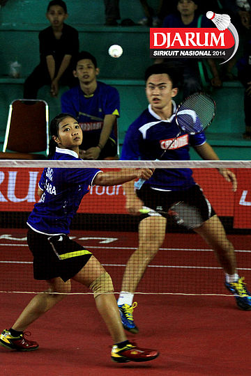 M. Roby Darwis/Monika Insany (Mutiara Cardinal) menyambar serve dari Feisal Wiranto/Serena Kani (Djarum Kudus)