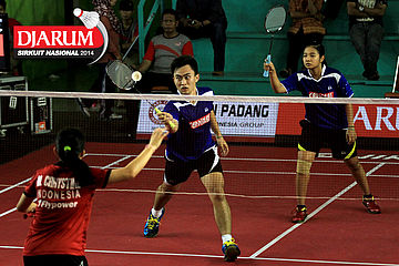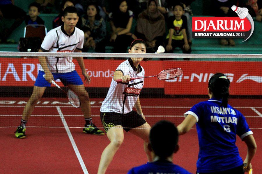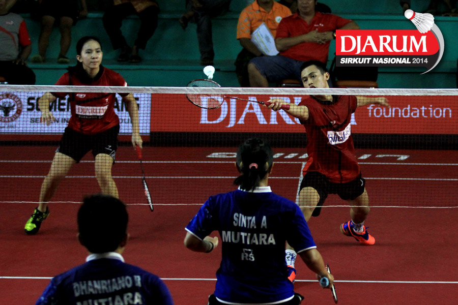 Reinard Dhanriano/Shinta Arum (Mutiara Cardinal) mengembalikan shuttlecock ke arah Tedi Supriadi/Mychelle Crhystine (Djarum Kudus)