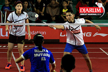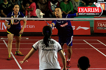 Fauzi Habibi/Apriyani Rahayu (Pelatprov DKI Jakarta) berhasil menghadang serangan yang dilepaskan Beno Drajat/Yulfira Barkah (Mutiara Cardinal)
