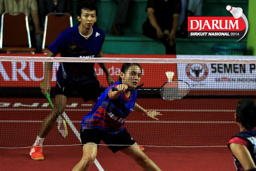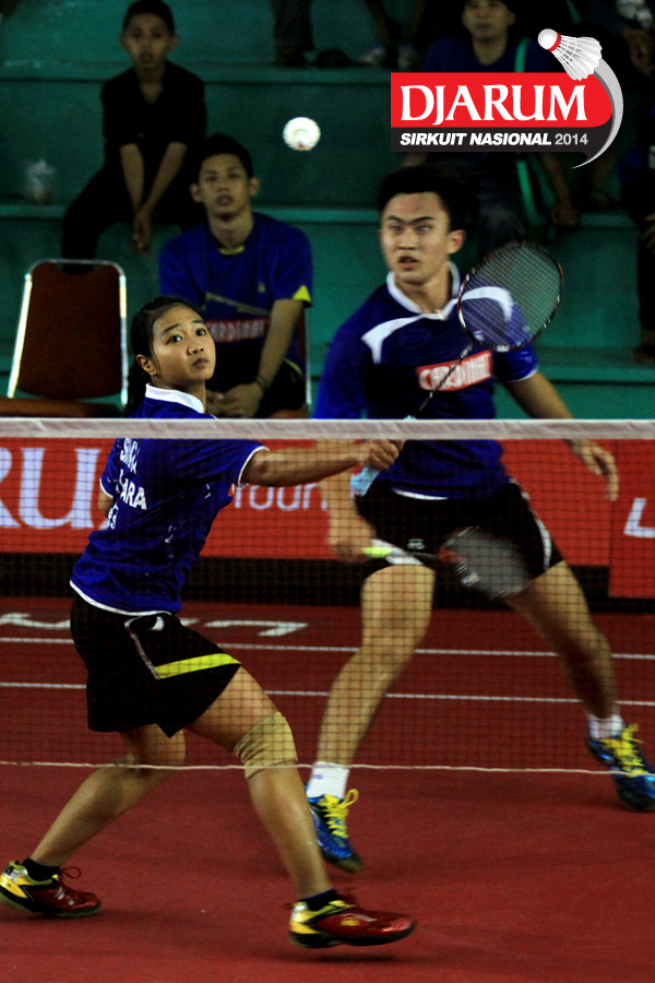Feisal Wiranto/Serena Kani (Djarum Kudus) menyambut serve M. Roby Darwis/Monika Insany (Mutiara Cardinal)