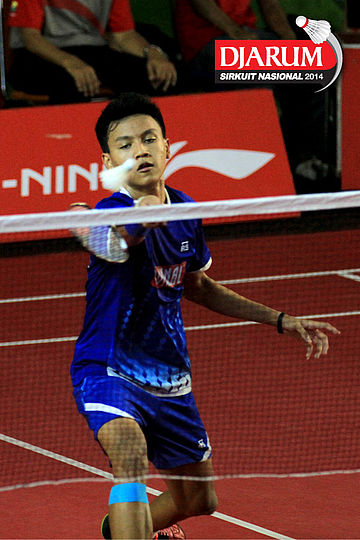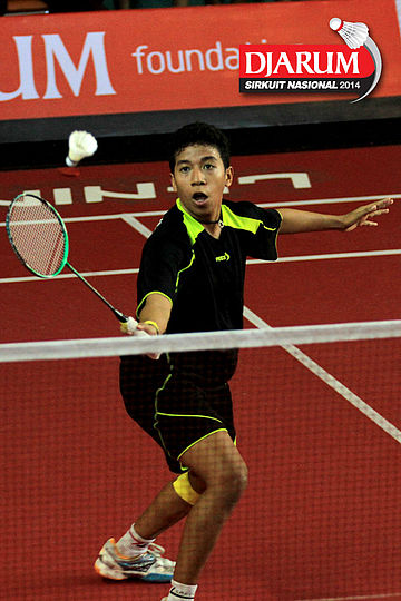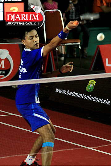 M. Lutfi Erlangga (Mutiara Cardinal) mengembalikan shuttlecock ke arah Redy Perdana (Pusdiklat Telkom)