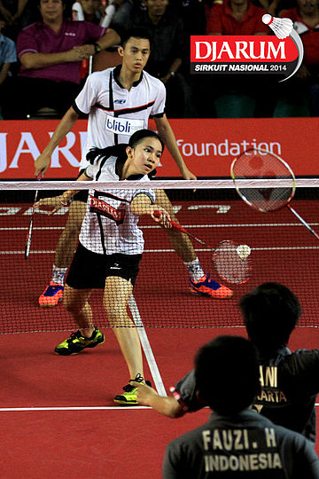 M. Robi Darwis/Monika Insany (Mutiara Cardinal) menyambut serve dari Devand Riefky/Vania Arianti (Djarum Kudus)