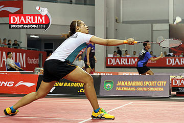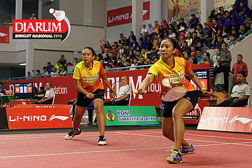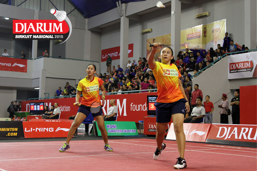 Shendy Puspa/Vita Marissa (Djarum Kudus) berhasil menghadang serangan yang dilepaskan Devi Tika Permatasari/Keshya Nurvita Hanadia (Berkat Abadi)