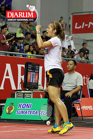 Selebrasi Febby Angguni (Tjakrindo Masters) saat berhasil mencuri poin dari Aprilia Yuswandari (Semen Gresik)