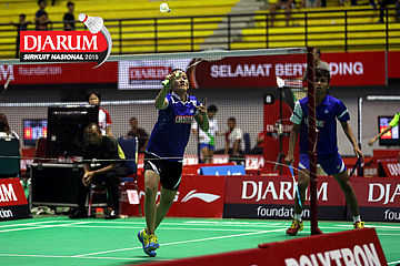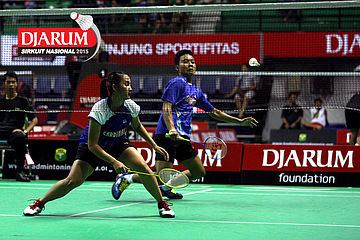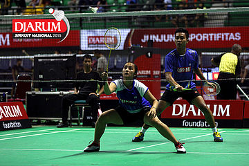 Haffiz Nur/Mia Dian (Djarum Kudus) mengembalikan shuttlecock.