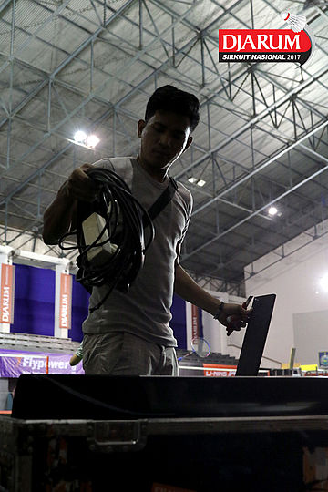 Dua Pekerja Saat Memasang Instalasi Logistik Djarum Sirkuit Nasional Li-Ning NTB Open 2017