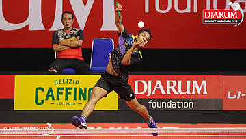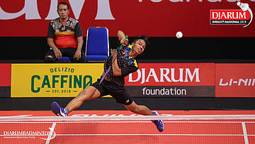 Satrio Wicaksono Zein (Indocafe, Medan) berusaha menggapai shuttlecock