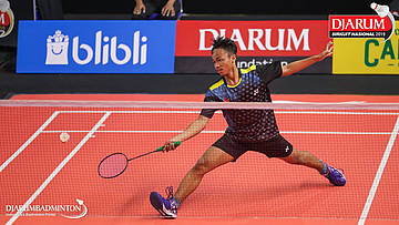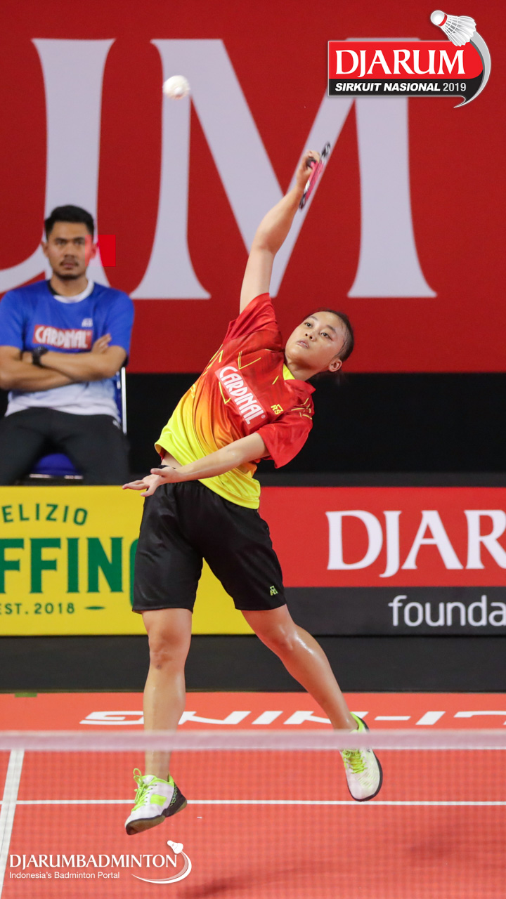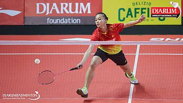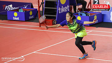Angelica Febriana Timporok (Mutiara Cardinal, Bandung) bersiap menyambut shuttlecock
