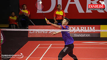 Wahyu Triansyah (Bank Sumsel Babel, Plb) bersiap menyambut shuttlecock
