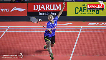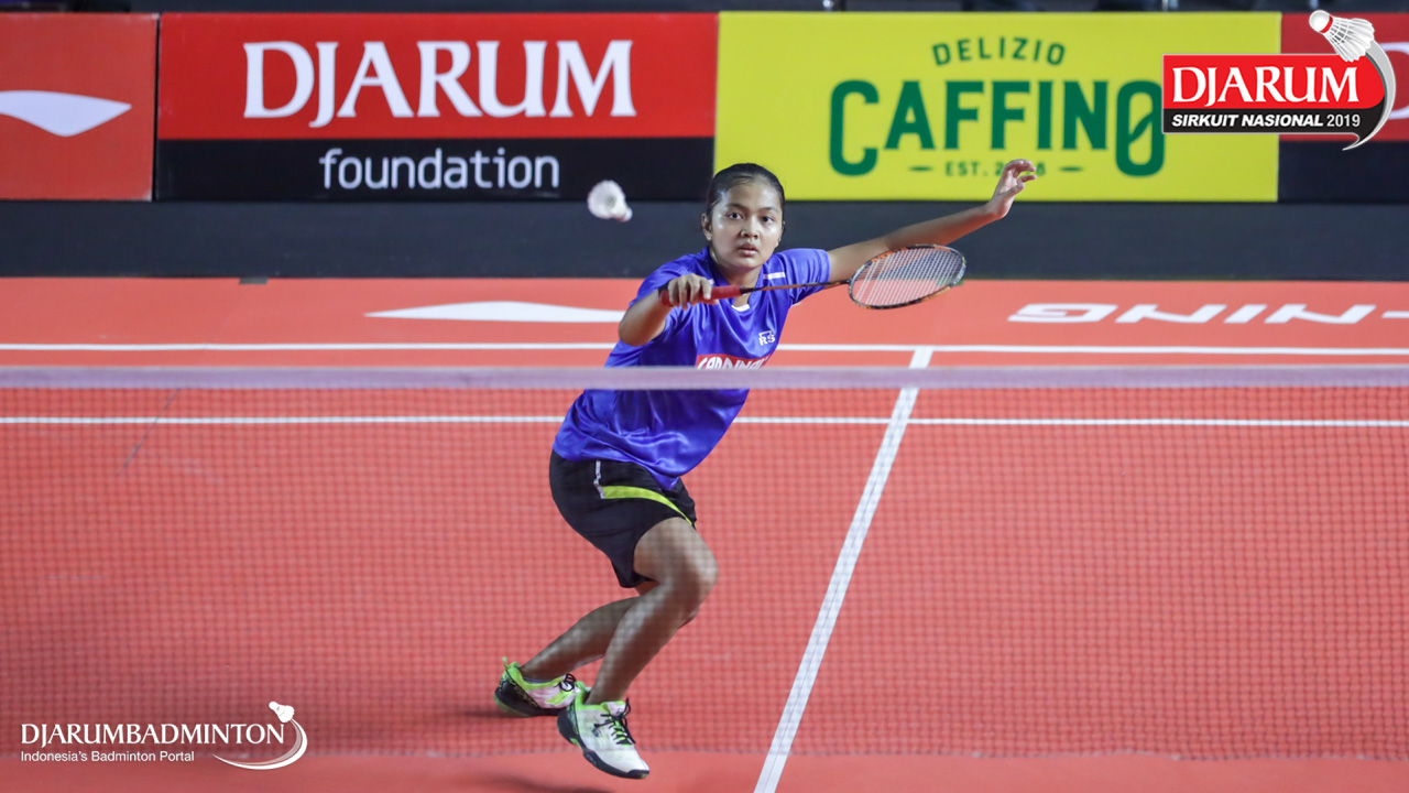 Gina Revina Aristy (Mutiara Cardinal, Bandung) bersiap menyambut shuttlecock