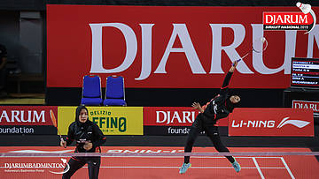 Gina Andryana+Mudawamah Fernalini (PB. Gemilang, Mataram) mengembalikan shuttlecock